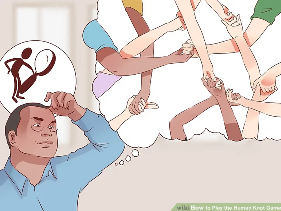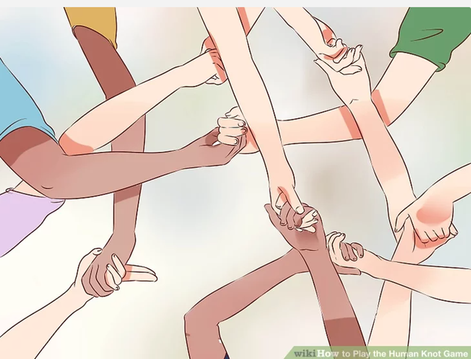 All you need to do is to get people into groups of at least six to eight (more is ok) and have everyone hand grasp one other hand in a complex way across the whole group — then, without letting go of hands, they have to untangle. Gently, of course.