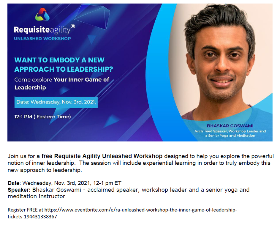 We are lucky enough to have a free workshop with Bhaskar, part of #RequisiteAgility and #consciousleadership unleashed. He’s calling it The Inner Game of #Leadership.