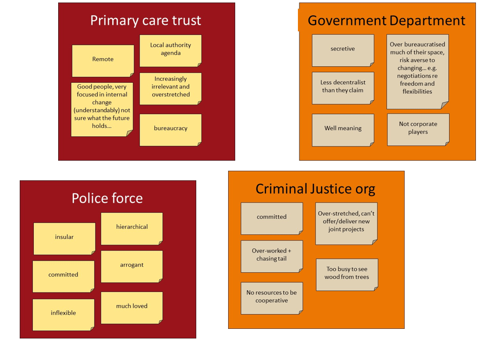 Everyone passed the envelope clockwise, and then used index cards to write down what people in their organisation would typically think about the organisation whose envelope they were holding.