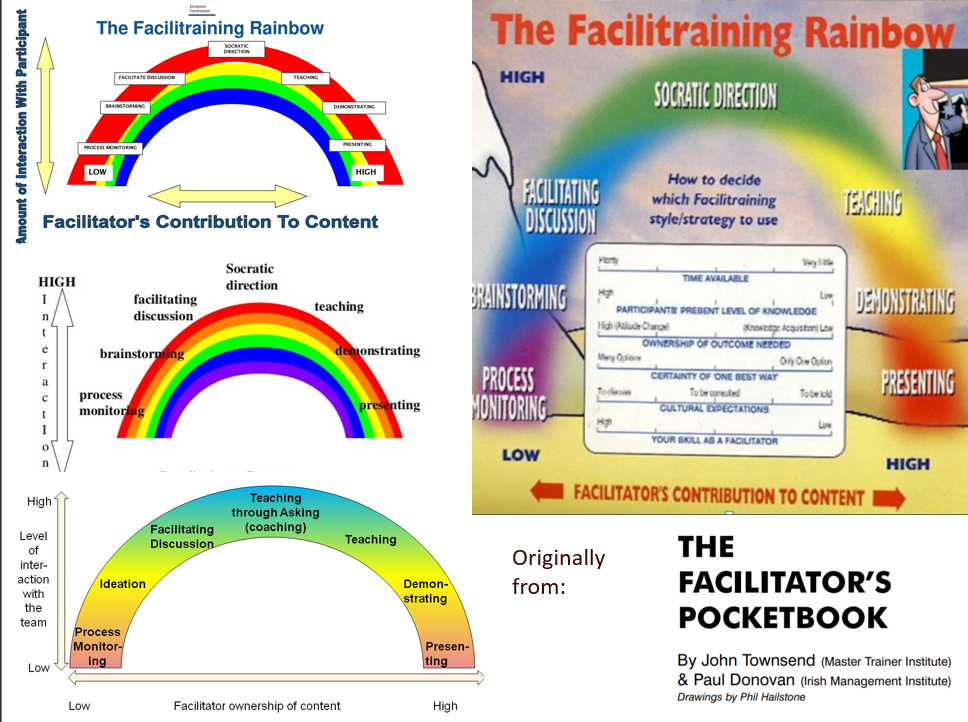 The facilitraining rainbow, itself, is a lot like this — though we know that comes from The Facilitator’s Pocketbook by John Townsend and Paul Donovan, and was originally drawn by Phi Halstone.