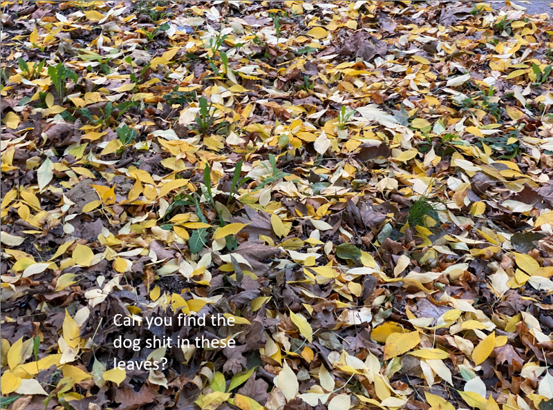 Finding his poo, so I can pick it up like a good citizen. He squats in the leaves or the grass, I mark the spot, I walk over and… where was it again?