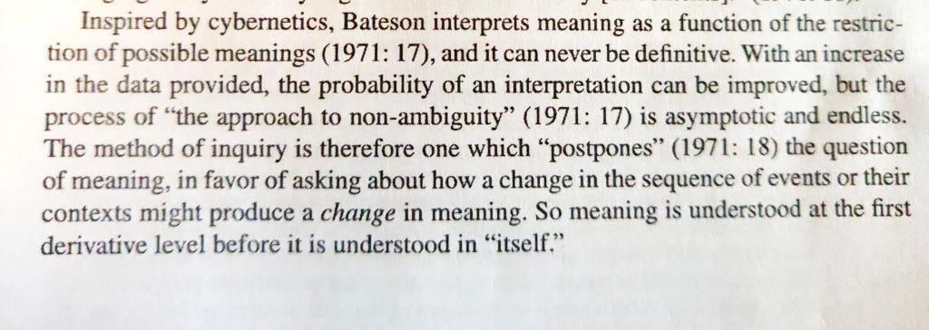 Test reads ‘Inspired by cybernetics, Bateson interprets meaning as a function of the restriction of possible meanings (1971: 17), and it can never be definitive. With an increase in the data provided, the probability of an interpretation can be improved, but the process of “the approach to non-ambiguity” (1971: 17) is asymptotic and endless. The method of inquiry is therefore one which “postpones” (1971: 18) the question of meaning, in favor of asking about how a change in the sequence of events or their contexts might produce a change in meaning. So meaning is understood at the first derivative level before it is understood in “itself.”’