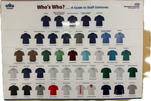 I spent two week in the Manchester Royal Infimary with my dad over Christmas – almost nobody introduced themselves, nobody had a name badge I could read… they often just barged in and ‘did things’. This was on the wall though!