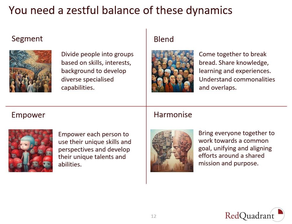 The best organisational dynamics focus on the flow between differentiation (specialisation, diverse perspectives) and integration (alignment, common purpose). Overemphasising one leads to dysfunction. Real leadership balances four dynamics: segment, blend, empower, and harmonise. Ignoring or overdoing any of these creates new problems. What’s your organisation’s blind spot? https://www.linkedin.com/posts/antlerboy_leadership-futureofwork-management-activity-7292857662013124608-mhBB