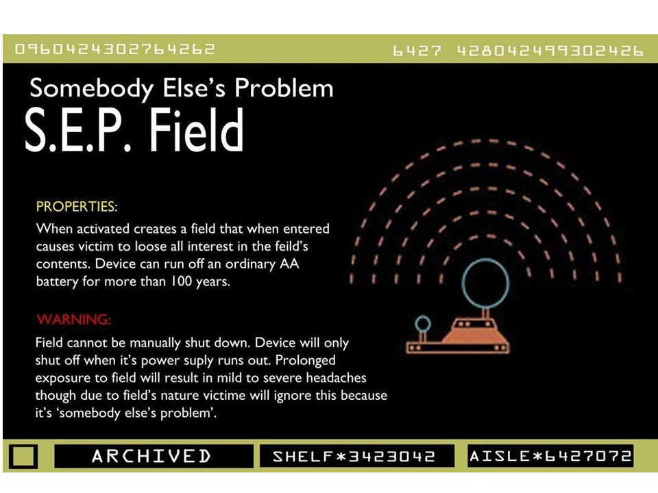 The Somebody Else’s Problem Field, from the Hitchhiker’s Guide to the Galaxy, makes things invisible – not physically, but psychologically. We ignore what’s in plain sight because we believe it’s not our responsibility.