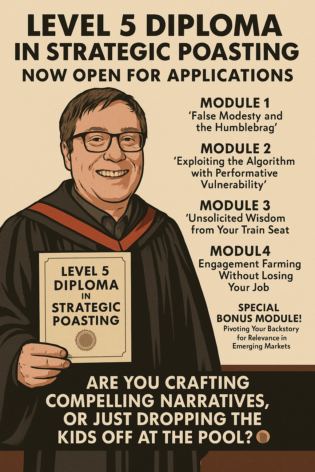 At last, I can announce a project I’ve been quietly developing with a cadre of elite #thoughtfluencers. Introducing the Level 5 Diploma in Strategic Poasting, now open for applications. https://www.linkedin.com/posts/antlerboy_thoughtfluencers-careerdevelopment-personaldevelopment-activity-7312730490875052032-K_AK
