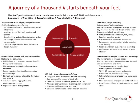 When you’re low on resources and have to merge political organisations starting yesterday, what’s the most important thing to focus on? We’re launching our new service offer: the RedQuadrant #devolution and #LGR Transition and Implementation Hub. It gives councils one accountable structure to ensure services are ‘more than’ safe and legal on ‘day one’, while embedding and building the capacity to transform. So, whether you’re submitting a reorganisation proposal this week or gearing up for November and asking yourself what comes next and where to begin, now is the time to start the conversation. If you want to see what “safe plus transform” really looks like in practice, we’d love to talk. https://www.linkedin.com/posts/antlerboy_redquadrant-lgr-devolution-transitionimplementation-activity-7376159021583507457-Fkol