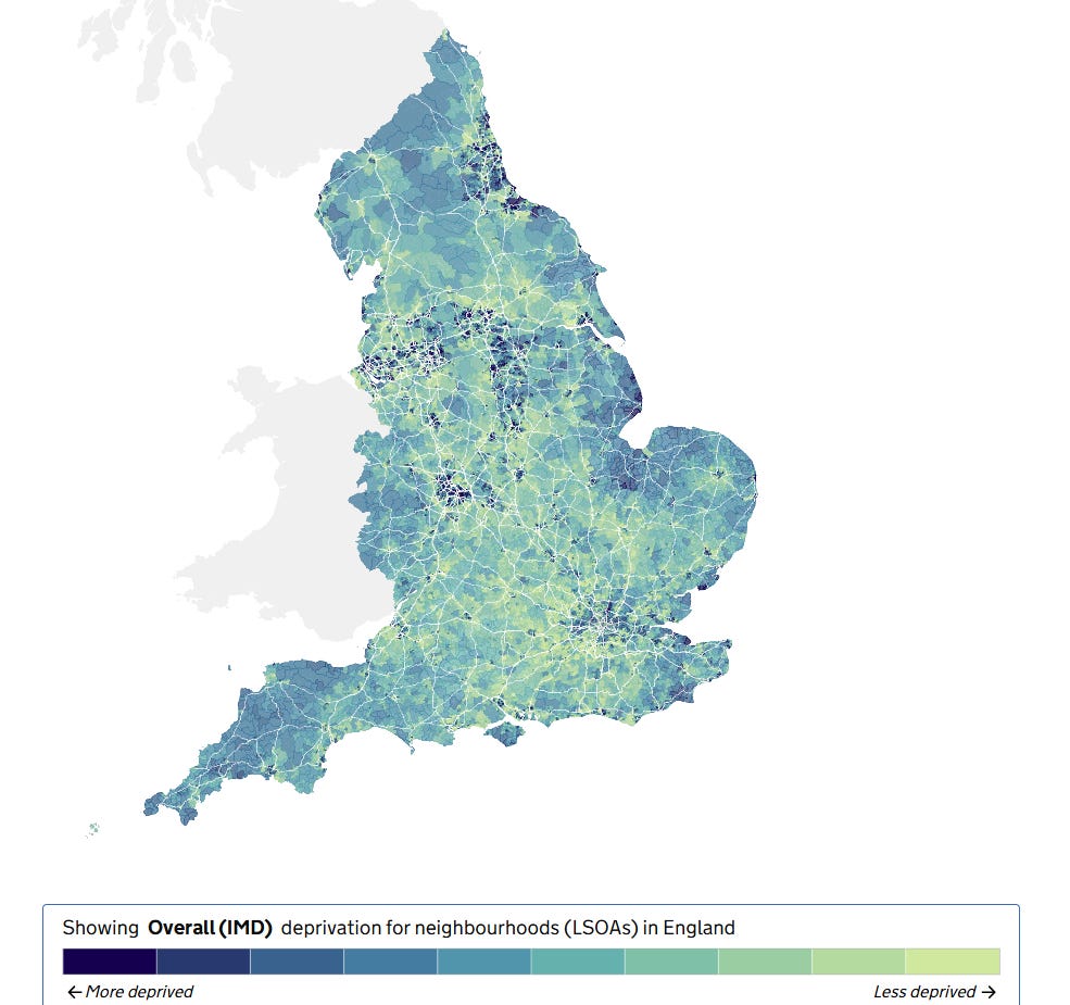 It looks very different – the north-south divide (which is real) fades out slightly, and we see coastal deprivation, the southwest and the Welsh borders, dark pockets of intense deprivation cheek-by-jowl with urban wealth.