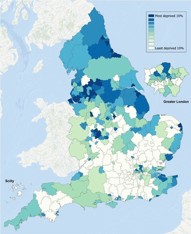 I was reminded of this when I saw that the new Indices of Multiple Deprivation, mapping relative deprivation across multiple factors across the country. Ben Murray shared a thoughtful short post reflecting on the national picture and how it reflects on St Helens Council, where he’s policy lead. He shared a map by council (the second map in this post, if I’ve got it right) – which strongly evidences the north-south divide in England.