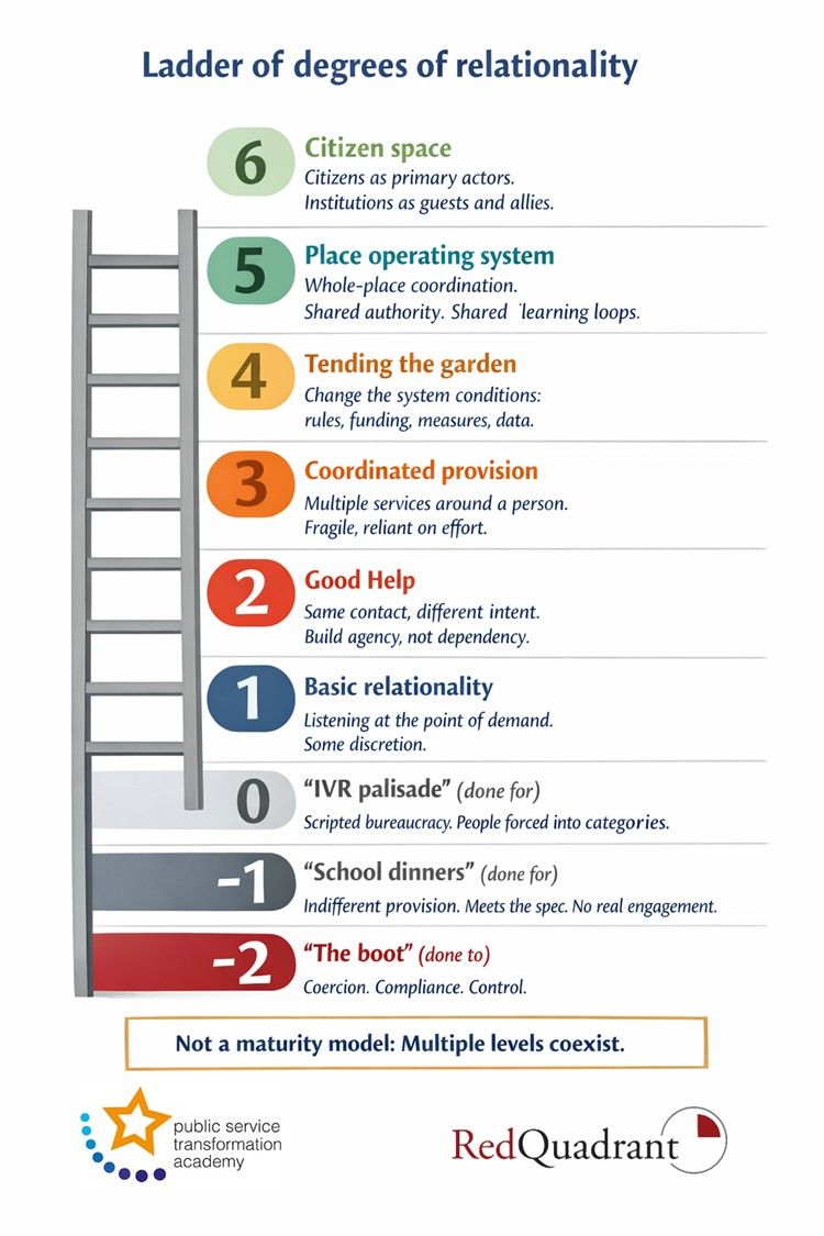 This is where most public services go wrong. We build a transactional world, then try to sprinkle relational moments on top. It doesn’t work. The system absorbs them.